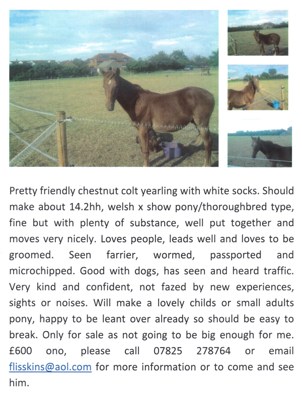 ARAB GELDING FOR SALE Rising 4 years, 14.2hh, chestnut. Is good to do in all ways. Broken in. Schooling well. Jumps, lunges and free schools. Hacks out with other horses and leads out on his own. Has been shown in hand this year and done well. Also has done clear round jumping. £2,300 ono Call: 07791 570312 Advert in: 20th June 2010 |