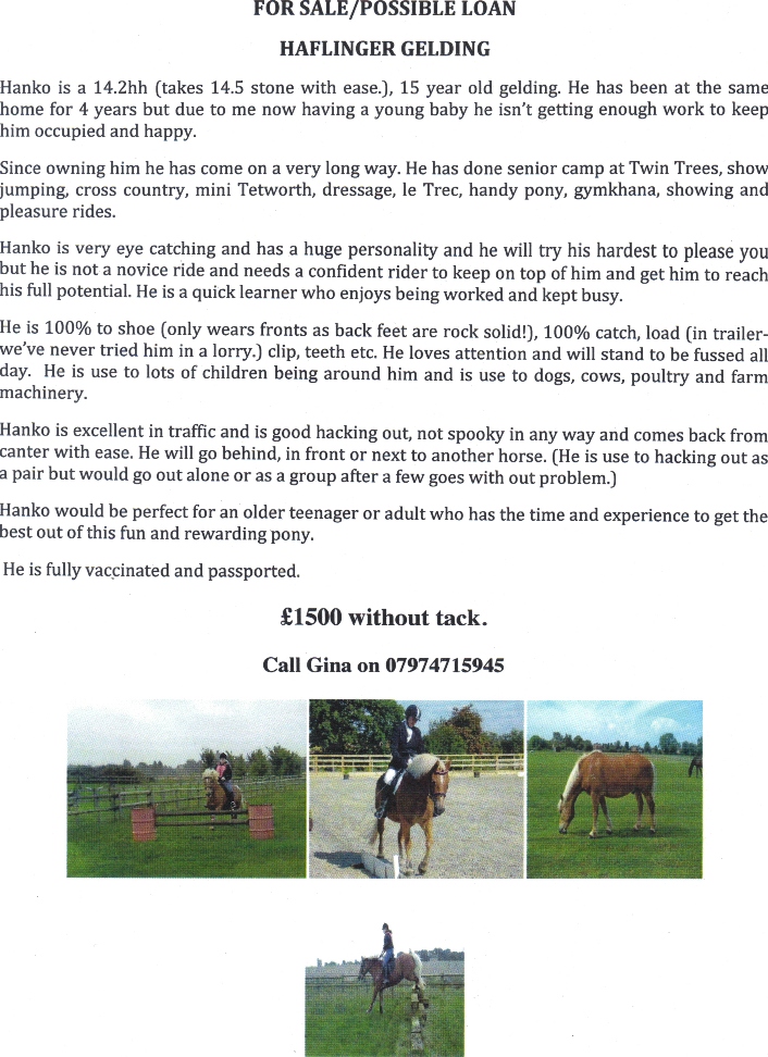 FOR SALE - "WOODIE" 13hh 10 year old Welsh grey gelding. Hacks alone or in company. 100% in traffic. Good to box, shoe, clip etc. Very loving little pony who has a lot to offer. For more info please call Louisa on 07854 559656 Advert in: 15th August 2010 |