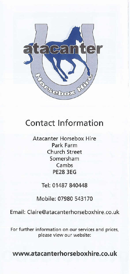 I have recently set up a self drive horsebox hire business. Prices start from just £60 for 6 hour hire which includes fully comprehensive insurance and equine rescue. Regards Janette Janette Perrett Phone no: 01920 438306 Advert in: 10th October 2010 |