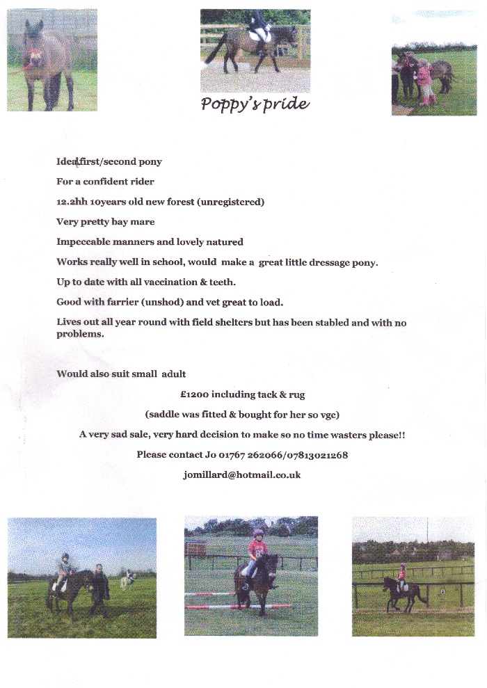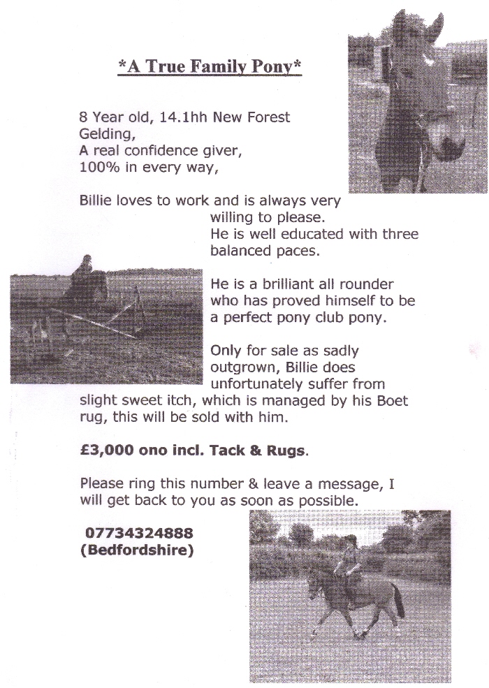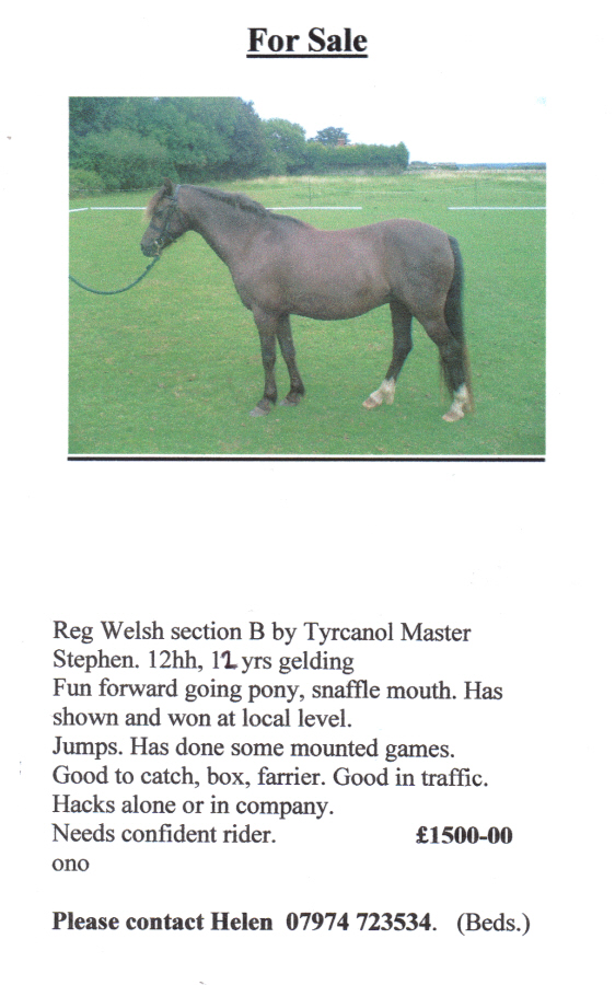 FOR SALE - "WOODIE" 13hh 10 year old Welsh grey gelding. Hacks alone or in company. 100% in traffic. Good to box, shoe, clip etc. Very loving little pony who has a lot to offer. For more info please call Louisa on 07854 559656 Advert in: 15th August 2010 |