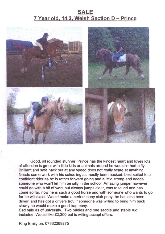 PONIES/HORSES FOR SALE Reg Welsh D colt - liver chestnut - will make 15.2hh. A big moving colt. Both parents can be seen. Very well handled. £800 Reg Welsh A 5 year old gelding - grey. Backed and working well. Good in traffic. A real people pony who loves attention. Will make a lovely child's pony. £800 Reg Welsh D bay mare, 15yrs old. Has been used as a brood mare for the last 5 years (mother of above foal). Now being brought back into work. Good to catch, shoe and in traffic. £1400. Tel: 07581 161262 or 07970 732737 Advert in: 20th August 2010 |