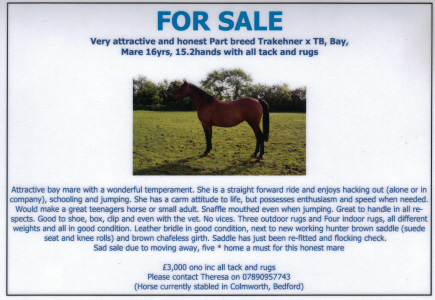 FOR SALE 17 year old 16 hand part thoroughbred bay gelding looking for a quieter life as a happy hacker with plenty of turnout. A friendly, fun companion but not a novice or child's ride. Price includes full wardrobe of rugs, boots, saddle and bridle £2,900. Kate 01767 691647 Advert in: 29th May 2010 |