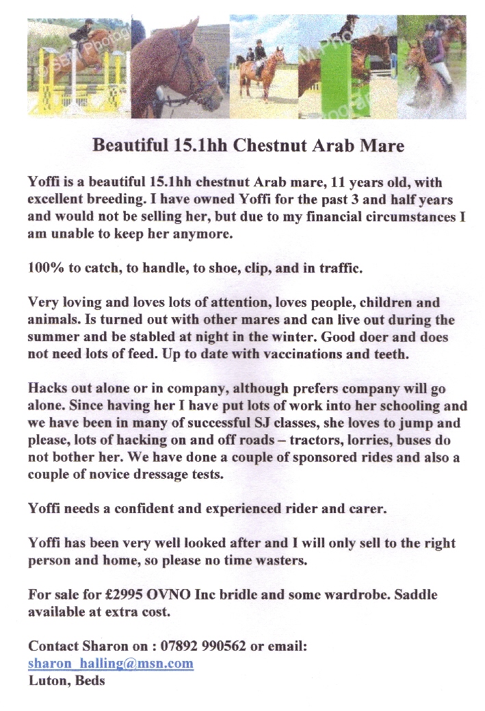 ARAB GELDING FOR SALE Rising 4 years, 14.2hh, chestnut. Is good to do in all ways. Broken in. Schooling well. Jumps, lunges and free schools. Hacks out with other horses and leads out on his own. Has been shown in hand this year and done well. Also has done clear round jumping. £2,300 ono Call: 07791 570312 Advert in: 20th June 2010 |