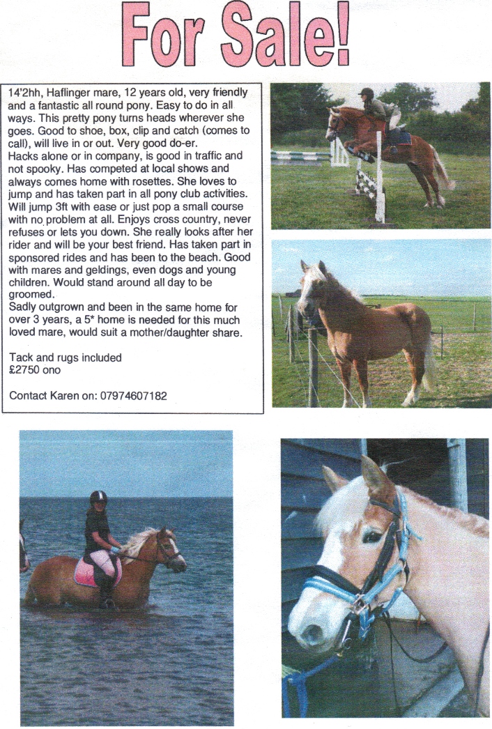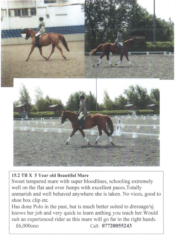 HORSES/PONY FOR SALE: Kimba: 14.3hh Bay Cob type mare age 9yrs. Petor: 15.1hh Bay Thoroughbred gelding age 9yrs. Star: 12.2hh Bright Bay Registered Welsh Section B mare age 12yrs. *Virtually new size 0 Barefoot Treeless saddle available to go with Star £200* Tolly: 15.1 Tri-Colour Irish Draught x TB Gelding age 18yrs. Melton: 16.3 Bay Thoroughbred gelding age 9yrs Call 07921 857660. Advert in: 27th November 2009 |