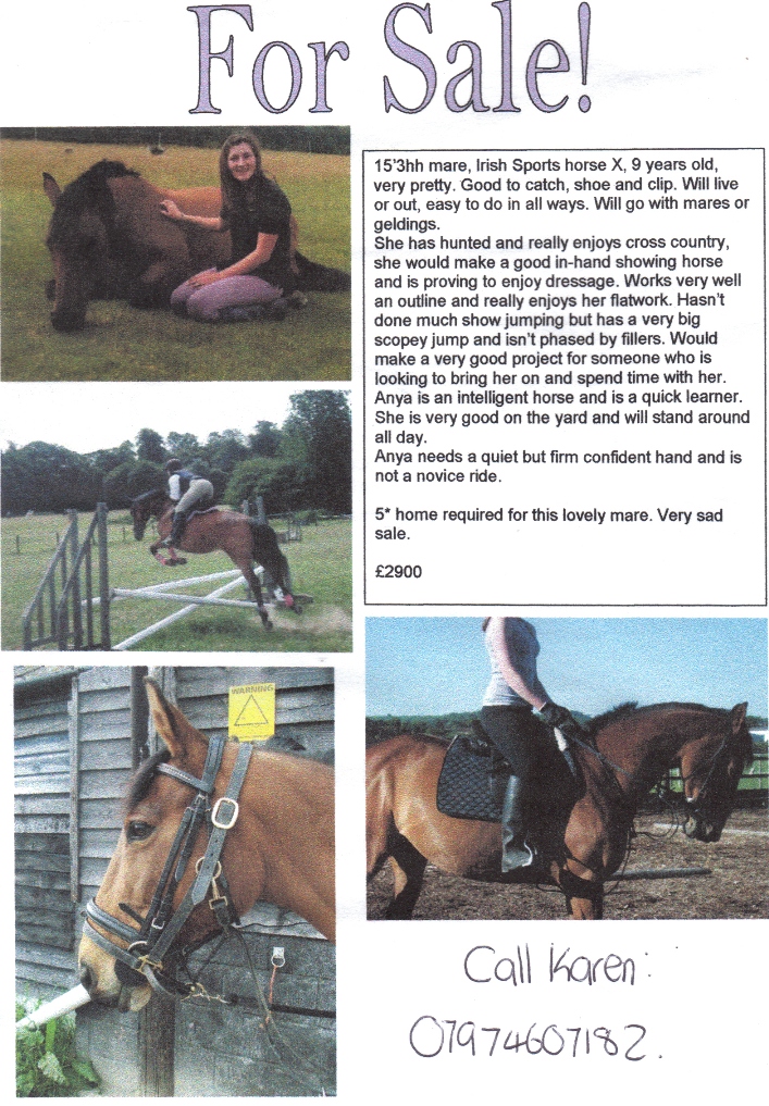 FOR SALE - 16.1hh CHESNUT MARE Dotty is a Dutch Warmblood with three lovely paces. As she is 17 years old, she will be happy enough to become a companion. Although she's 17, she has a lot left in her and would suit a happy hacker. Good to load, clip, shoe and hack. Only for sale due to lack of time as I have another horse. Open to offers. Call: Laura - 07841 379821 Jenny - 07803 591714 Home: 01462 892253 Advert in: 23rd February 2010 |
