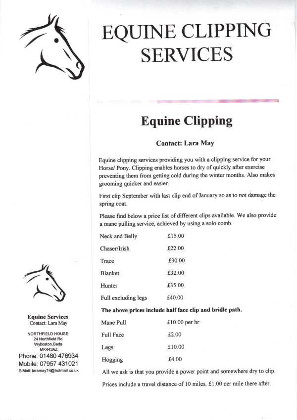 MOBILE CLIPPING SERVICES A professional and personal clipping and trimming service for your horse/pony. HUNTER CLIP £30.00 Minimum charge £12.00 plus travelling 20p/mile. Generator if required - £5.00 Call Carolyn Cox on 01234 781917 or 07791 106081. Advert in: 28th March 2009 |